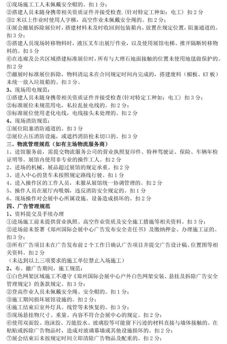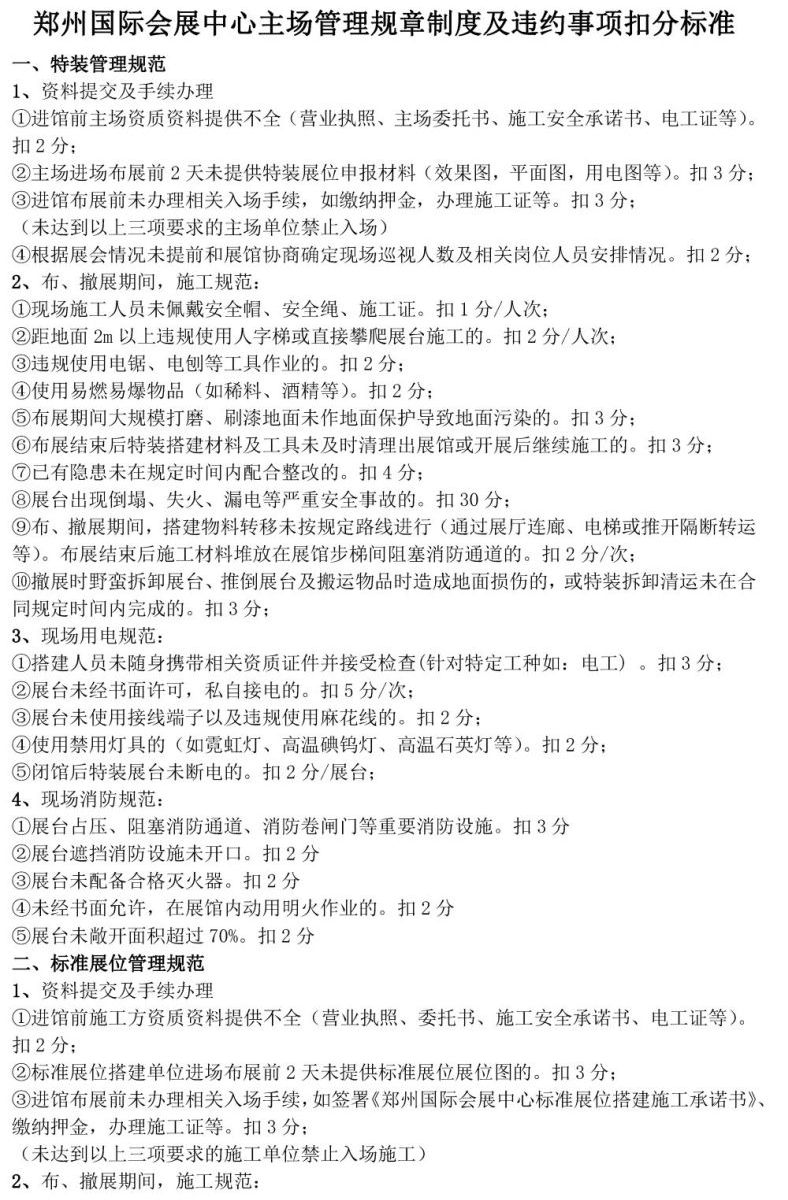 鄭州國際會(huì)展中心主場(chǎng)管理規(guī)章制度及違約事項(xiàng)扣分標(biāo)準(zhǔn)