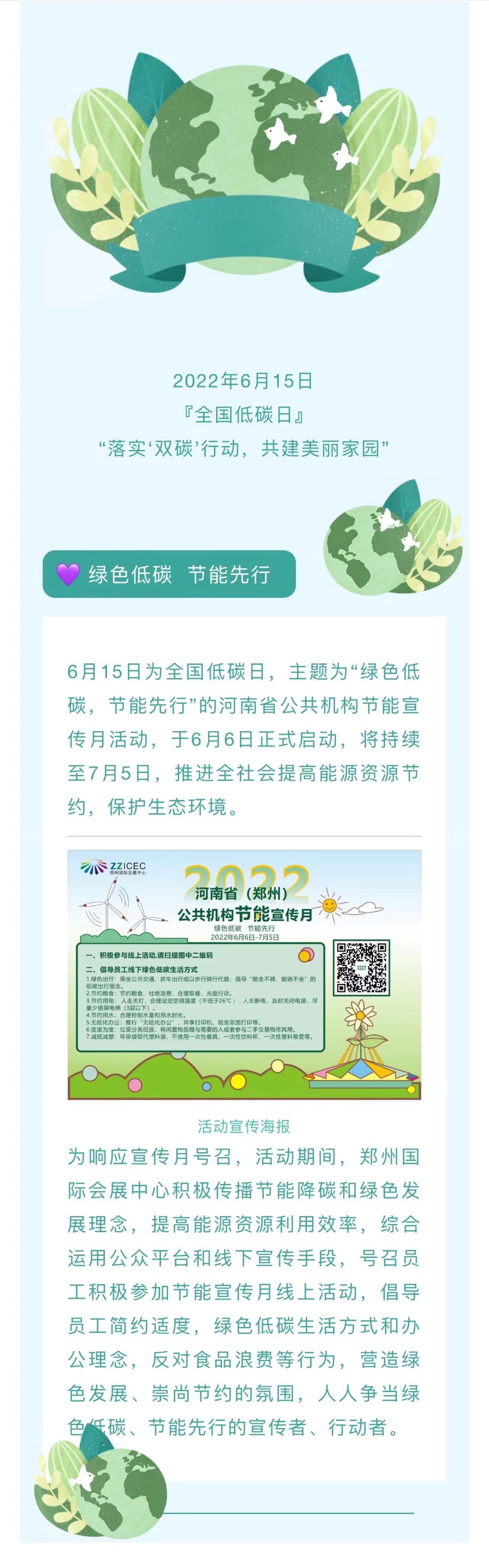 6月15日為全國低碳日,主題為“綠色低碳,節(jié)能先行”的河南省公共機(jī)構(gòu)節(jié)能宣傳月活動(dòng),于6月6日正式啟動(dòng),將持續(xù)至7月5日。為響應(yīng)宣傳月號(hào)召,活動(dòng)期間,鄭州國際會(huì)展中心積極傳播節(jié)能降碳和綠色發(fā)展理念,提高能源資源利用效率,綜合運(yùn)用公眾平臺(tái)線和線下宣傳手段,號(hào)召員工積極參加節(jié)能宣傳月線上活動(dòng),倡導(dǎo)員工簡約適度,綠色低碳生活方式和辦公理念,反對食品浪費(fèi)等內(nèi)容,營造綠色發(fā)展、崇尚節(jié)約的氛圍,人人爭當(dāng)綠色低碳、節(jié)能先行的宣傳者、行動(dòng)者、引領(lǐng)者。